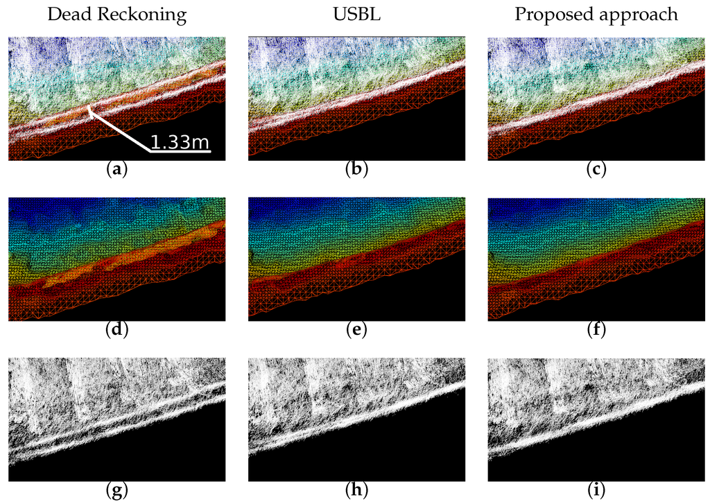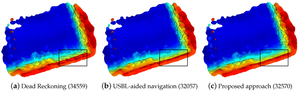 The top view of the 3D maps produced after the experiments are presented in Figure 12. There, three surfaces are created for different navigation methods: dead reckoning (Figure 12a), USBL-aided (Figure 12b) and the currently proposed algorithm (Figure 12c). Regarding the number of occupied cells, the proposed method occupies 32570 cells, 5.76% less than the dead reckoning model (34559) while the one aided by the USBL occupies 7.24% less cells (32057). Moreover, the black squares represented in each one of the views highlight the places where it is easier to observe the consistency of the map near to the harbor wall. This area is analyzed in detail in Figure 13. In the left column, the one corresponding to the dead reckoning navigation (views Figure 13a,d,g), clearly shows two parallel lines on the point clouds which correspond to the wall being observed during the first and second laps of the mission. In the other two columns, the one corresponding to the usbl navigation (views Figure 13b,e,h), and the one of the proposed SLAM algorithm (views Figure 13c,f,i) show a single wall, and, thus, a better agreement between the different scans. However, if the point cloud from the USBL navigation is analyzed in detail in the bottom left corner (see Figure 13h), there are still some residues of the two observations of the wall that do not appear in the one from the proposed approach.