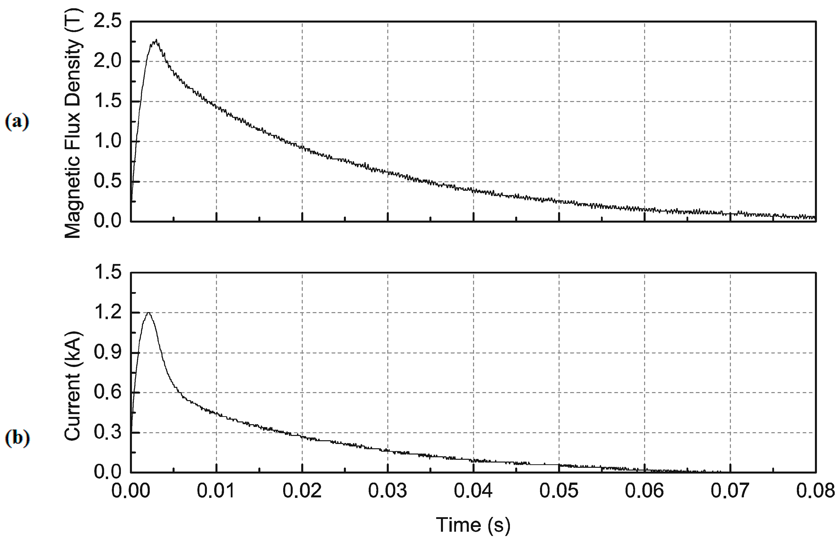 Impulse magnetization was conducted using an impulse magnetizer. A magnetization fixture was supplied from an impulse magnetizer, designed and manufactured in the Tele & Radio Research Institute, that consists of a bank of capacitors with C = 1 mF capacitance and regulated voltage Uc from 0 to 5000 V. The impulse current is triggered by a thyristor as an electronic switch. The impulse magnetizer is also equipped with a diode that enables an aperiodical shape of current waveforms vs. time in the winding. The impulse magnetizer is supplied from an AC 230 V, 50 Hz line.