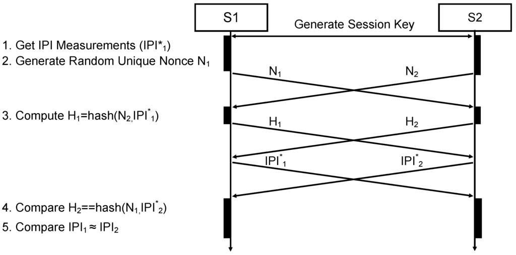 - Possible replay attacks and simultaneous connection attempts are additionally hindered by enforcing the use of a unique random nonce , which in our case is a 32 bit random integer number. The nonce is generated in Step 2, and has to be used by the peer for the hash generation (Step 3). Therefore, is the hash value of the concatenated received nonce and the array of measured IPI values.
