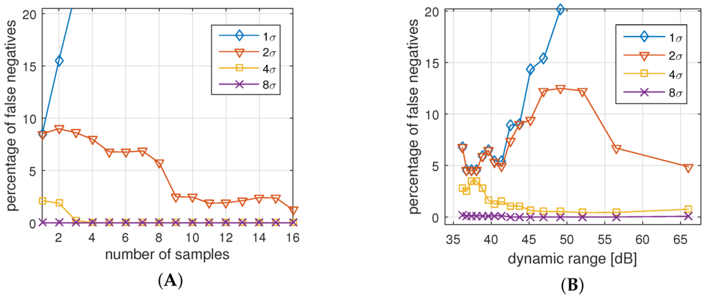 - For all cases but , an increased number of samples reduces the number of false negatives. The reason is that a higher number of samples help to reduce the effect of possible outliers.