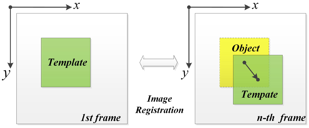 High-speed cameras have strict efficiency demands for image processing techniques to realize real-time measurement. Phase-based optical flow [,,,] provides an efficient approach to estimate velocity component at all points in the image sequences. However, spatial filtering of phase-based optical flow is time-consuming, and the determination of coefficients for spatial band-pass filter is complex. These characteristics make phase-based optical flow a more appropriate choice for post-processing. Conventional motion extraction algorithms based on image feature matching are commonly subjected to many shortcomings, such as complex process and multi-parameter adjustment. Most template matching algorithms, i.e., sum of squared differences (SSD) or normalized cross-correlation [] (NCC), need to scan a template on the whole image to find the best matching. Moreover, since the minimal unit in a video image is one pixel, these algorithms can only achieve integer level resolution. Such performances in accuracy and efficiency are far from satisfaction in many practical applications, particularly for long-distance or small-amplitude measurements. In the research field of image registration, different subpixel level algorithms in both time and frequency domain have been proposed, such as the enhanced correlation coefficient (ECC) algorithm [] and the upsampled cross-correlation (UCC) algorithm []. However, either the image interpolation [,] or fast Fourier transform (FFT) upsampling operation [] will increase heavy computation burden, which makes them not very suitable for real-time measurement in high-speed sensor system.