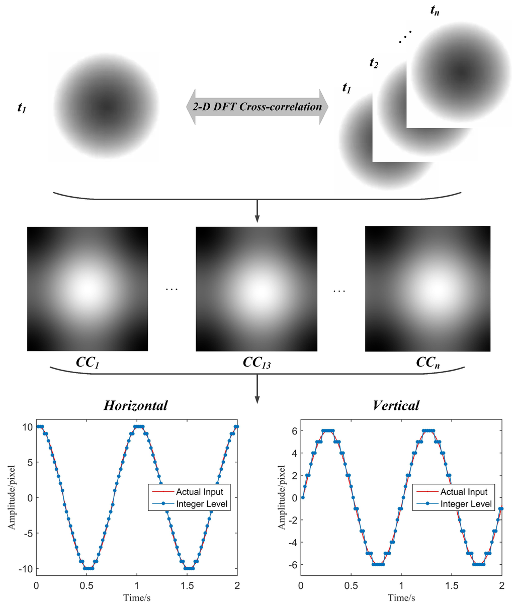 The rotation frequency f of the virtual circle is set to be 1 Hz and the sampling frequency is 50 Hz. The MCC-based motion extraction algorithm is applied to capture the vibration signals of the black circle in both horizontal and vertical directions. The implementation procedure of the MCC-based algorithm and the motion extraction results is illustrated in Figure 3. The template image and object images can be selected in the first frame and successive frames. Then the cross-correlation matrices () between 2D DFT of the template image and every object image are calculated. Finally, the integer level motion information can be obtained by locating the maximum value in each matrix. The results indicate that the MCC-based algorithm successfully extract the motion signals of the black circle in the simulation. The wave shapes in both horizontal and vertical directions match well with the programmed actual input.