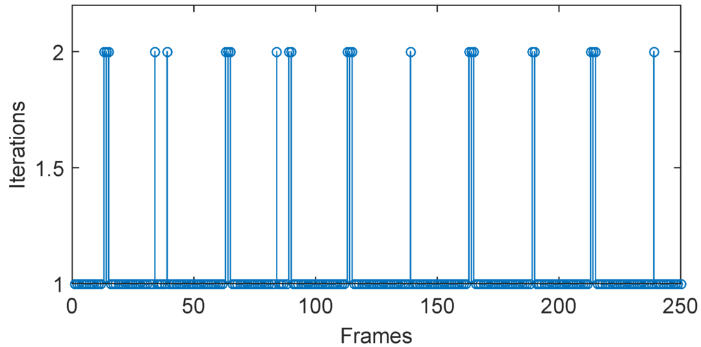 Figure 5 shows the number of iterations using the modified Taylor approximation refinement in the simulation test. It can be seen that most motion extraction steps are accomplished with one rounding-iterative Taylor approximation operation, and rest calculations are completed within two rounding-iterative Taylor approximation operations. As is shown in Figure 6, the refined vibration signals in both vertical and horizontal directions are obviously smoother than the curves obtained by using integer level MCC-based algorithms. Quantitive error and time-consuming analyses will be discussed at the end of this section.