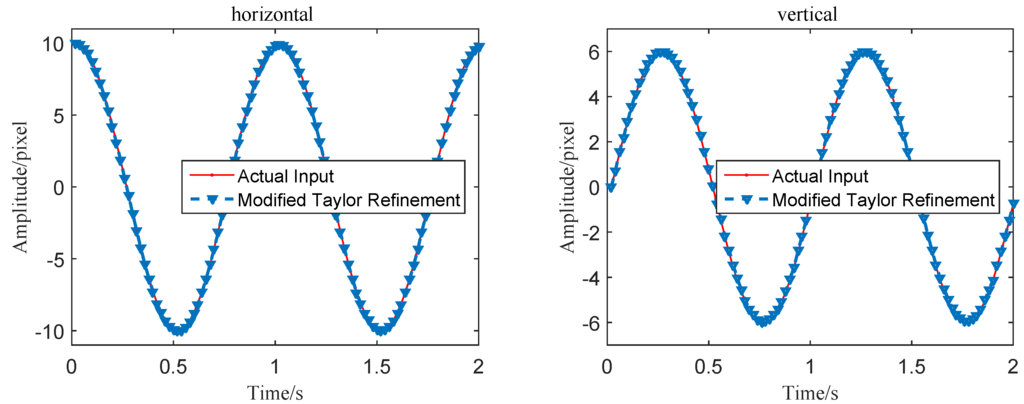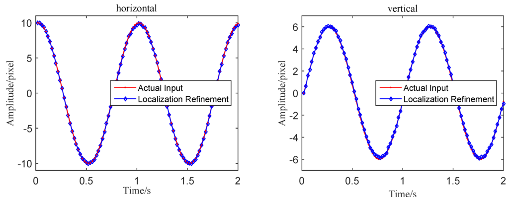 Using the 2D DFT cross-correlation values, this subpixel improvement approach naturally shows strong robustness to the effect of illumination. This method can be appropriately used to refine the integer level vibration signals in the simulation. In Figure 8, the obtained wave shapes are much smoother and match well with the actual inputs compared with the MCC-based results. Therefore, the proposed surface fitting algorithm also improves the extracting accuracy successfully.