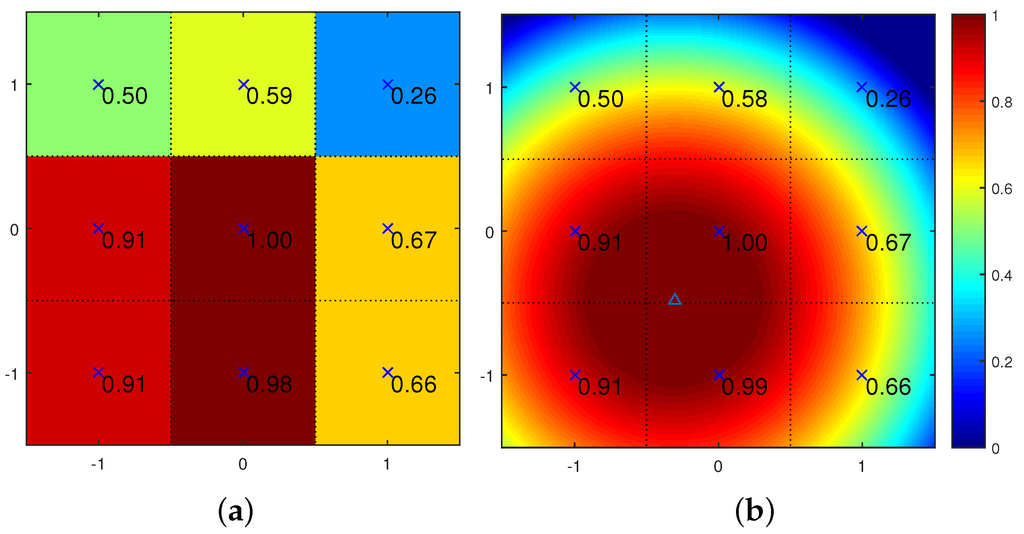 To illustrate this quadratic surface fitting vividly, a simple example between the template image (cut from the 1st frame in the simulation test) and the object image (cut from the 60th frame in the simulation test) are shown in Figure 7. Since the cross-correlation values around the maximum are quite close to each other, a normalized operation is helpful to clear observation. The original best-matching cross-correlation point and eight fitting points around are shown in Figure 7a, and the calculated quadratic surface is given in Figure 7b. The new extreme point marked with a triangle marker can be considered as a better estimation of the best-matching location.