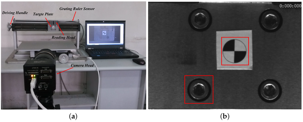Figure 9a shows the experiment equipment. From the figure, the grating ruler displacement sensor was installed on the moving table platform with its reading head moving synchronously with the target plate in horizontal direction. With this structure, the vibration of target plate can be recorded by the grating ruler displacement sensor and the vision-based sensor simultaneously. The camera head of the vision-based sensor is installed on a tripod for steady output. The video camera was placed 1 m away from the table along the optical axis so that the target plate can always exist in the imaging plane. The sampling frequency of the grating ruler sensor was set to be 20 Hz, and the grating pitch was 0.02 mm with a resolution of 1 μm. The camera captured the moving target at a resolution 400 pixel × 300 pixel with 200 fps during the shooting process. An artificial circle target with a diameter of 20 mm was pre-installed on the target plate for camera calibration.