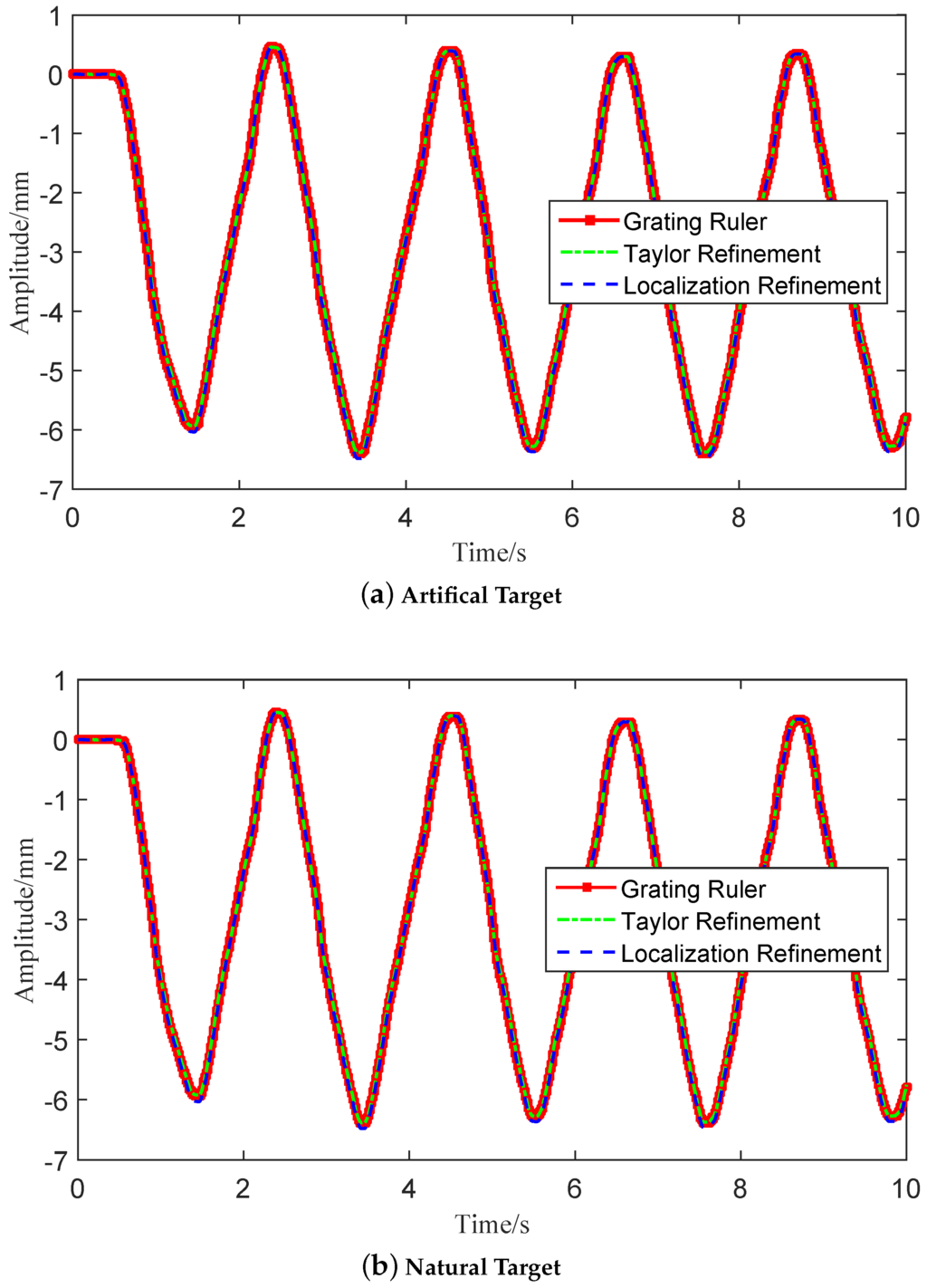 Measurement comparisons between the grating ruler sensor and the developed vision-based sensor with refined algorithms are given in Figure 10. It can be seen that the vibration signals extracted using the modified algorithm match well with the data collected with the grating ruler sensor in both artificial target conditions and natural target conditions. Quantitive analysis about the tracking error and computation time are given in Table 2. Assuming that the grating ruler data was the true motion signal, the modified Taylor refinement algorithm achieved the lowest NRMSE of 0.61% and NRMSE of the localization refinement algorithm was 0.73%. The localization refinement algorithm spent only 0.94 ms in one motion extraction step, which is proven to be more efficient than the Taylor refinement algorithm (1.21 ms). Furthermore, both of the two modified algorithms are at least five times faster than the traditional UCC algorithm and execute with better error performance.