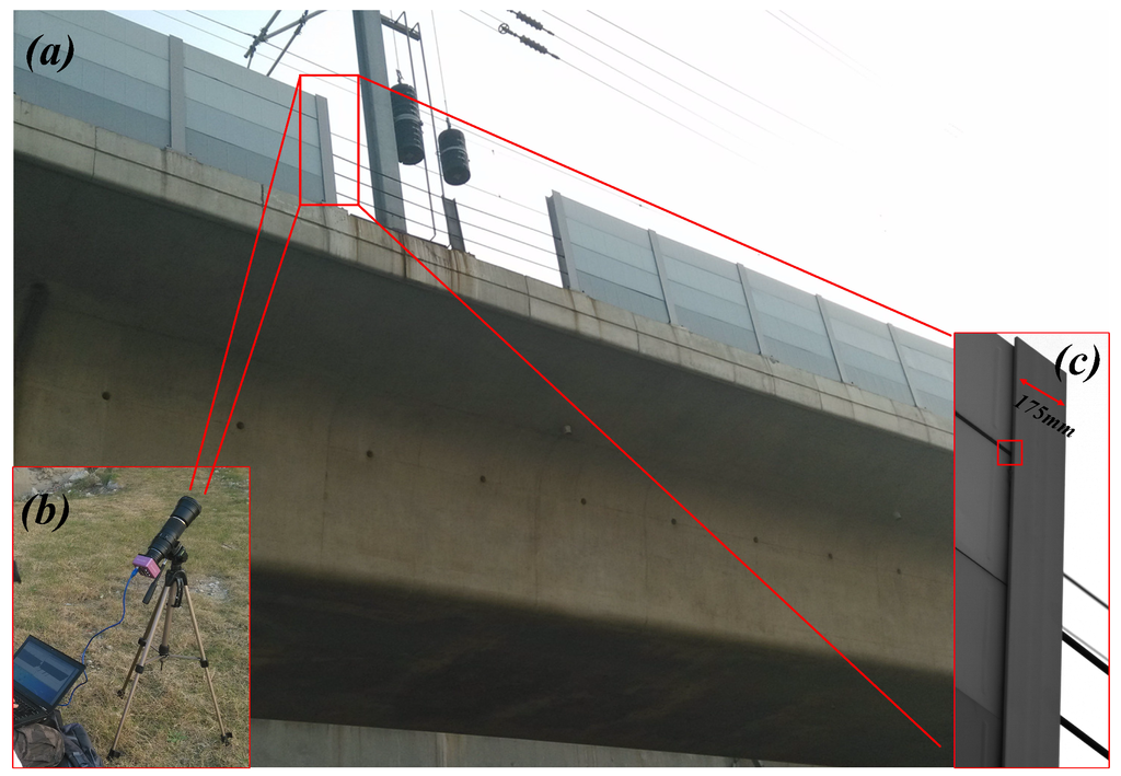 To validate the effectiveness of the proposed algorithms in extracting the vibration signal of actual large-scale structures, a field test was carried out to analyze the vibration of the sound barriers in KunShan City, which is an important railway hub city in East China. As is shown in Figure 11, the high-speed camera system was placed on the ground below the viaduct and the distance between the camera head and the barrier target was about 30 m. The vision-based sensor recorded video containing the vibration signal of the sound barrier at a sampling frequency of 232 fps when a high-speed train was passing by.
