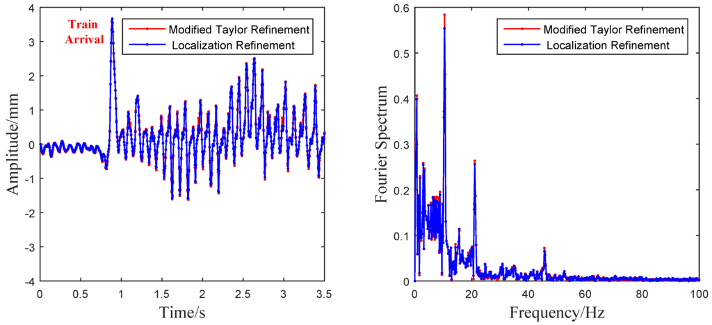 The vibration amplitude and its Fourier spectrum in the horizontal direction is shown in Figure 12. Both of the two modified algorithms clearly obtained similar results in terms of the time-domain wave shapes and frequency-domain spectrums. The vibration time history clearly displayed the wave shapes when the train passed by, and the moment of train arrival is marked red in Figure 12. Three obvious spectral peaks, 10.42 Hz, 21.07 Hz and 45.77 Hz, can be observed in the Fourier spectrums. In reality, it is difficult to extract the natural frequencies of a bridge from its train-induced dynamic responses and the bridge response is dominated by the excitation frequency associated with the train passing [,]. Because the natural frequencies of the sound barrier are far away from the excitation, frequency from the train (less than 5 Hz) and the frequency of wind load caused by the train carriages is about 2 Hz ∼ 4 Hz. The frequencies 10.42 Hz, 21.07 Hz and 45.77 Hz are considered excited by the pulsed wind excitation caused by the locomotive []. Thus, these peaks can be considered as the characteristic frequencies of the measured sound barrier. Moreover, it is worth mentioning that the two modified algorithms run very fast in the field test. The elapsed time of each extraction using both of the two algorithms was less than 1.5 ms. So far, the dynamic characteristic of the sound barrier, which was previously difficult to detect before, can be easily analyzed with the vision-based sensor system designed in this paper.