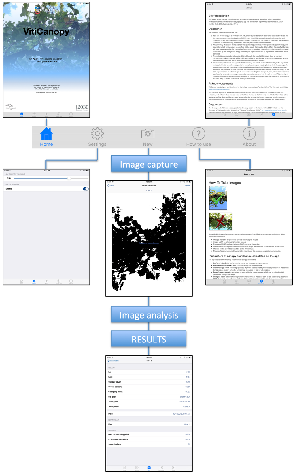 VitiCanopy, once installed and launched on the device, presents a “Home” page with a menu consisting of five icons (Figure 2). An instructional YouTube video guiding users through the process is available in [29]. The “Home” page contains the University of Adelaide and funding bodies’ logos, with a brief description of the App. The “Settings” menu allows the user to set up the gap fraction threshold (see below) and to enable/disable the location services linked to the GPS. The “New” menu allows the user to perform new measurements. The “How to Use” menu contains information on how to acquire and analyse images and a description of the algorithms used to calculate canopy parameters. This menu also has examples of suitable and unsuitable images; describing most common errors, such as capturing the sun in the image and the operator head in the frame, among others. The “About” menu contains: (i) a brief description of the capabilities of the App; (ii) disclaimer notice; (iii) acknowledgments; (iv) supporters; (v) development team; (vi) programmers; (vii) source code; (viii) contact information; and (ix) a list of references.