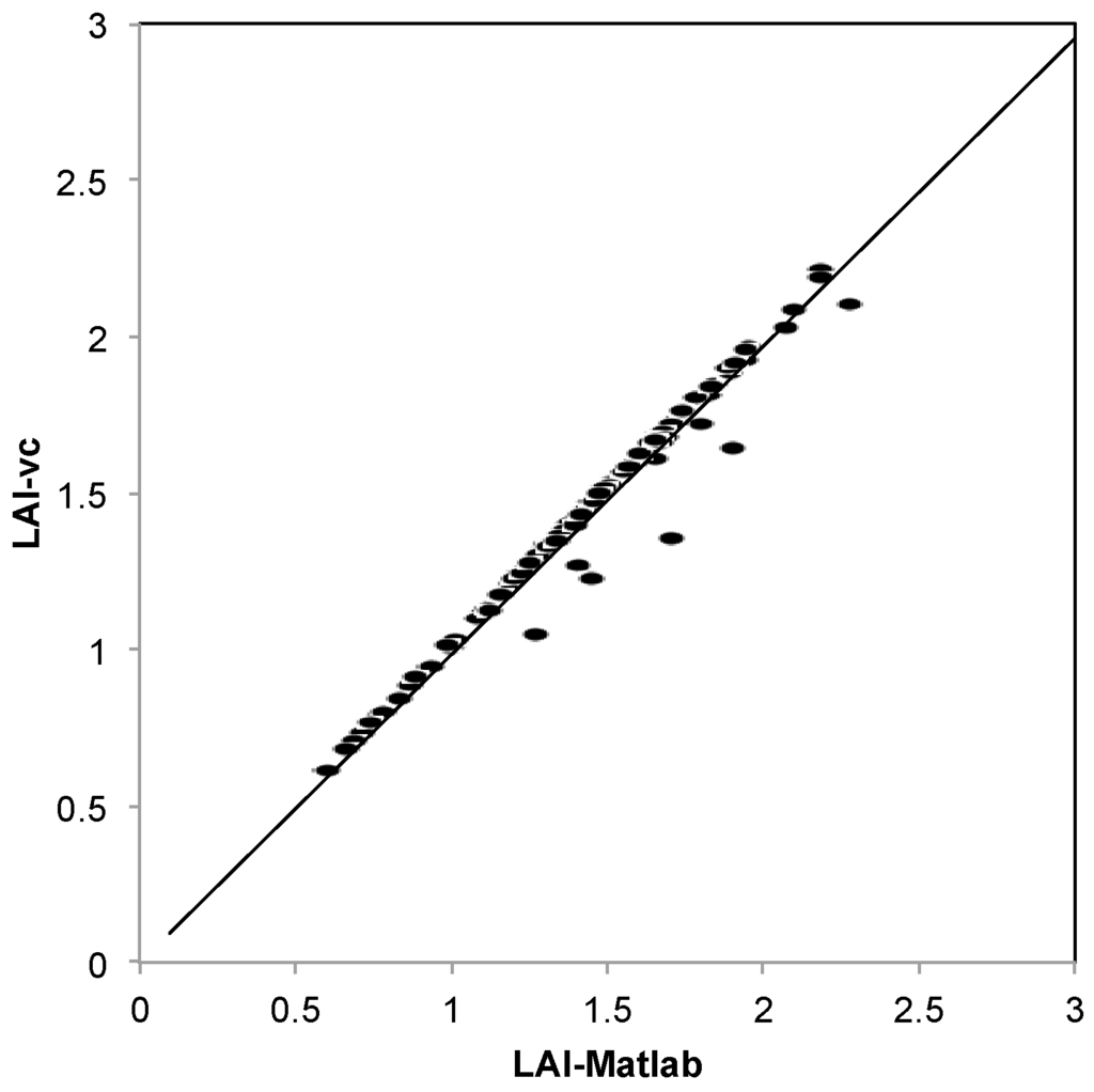 VitiCanopy, for the majority of the images analyzed, produced near identical results to those obtained with the previously developed Matlab code with the correlation producing a R2 = 0.97 and a slope b = 0.98 with minimal SEE (0.3529) and RMSE (0.056) and very high statistical significance of the regression (p < 0.00001) (Figure 3). The clumping index (Ω(0)) was on average 0.78 with a range from 0.61 to 1 for both methods.
