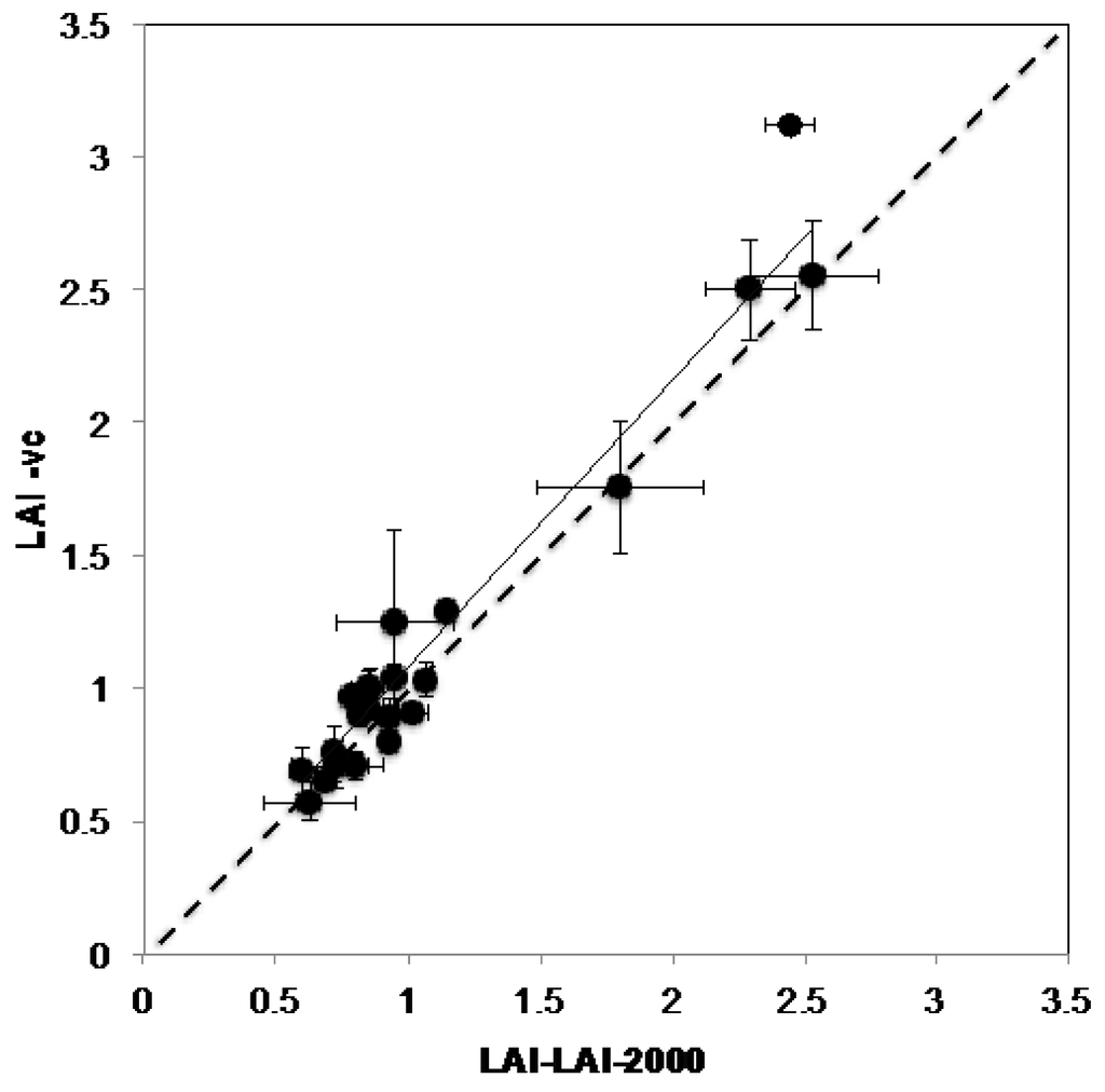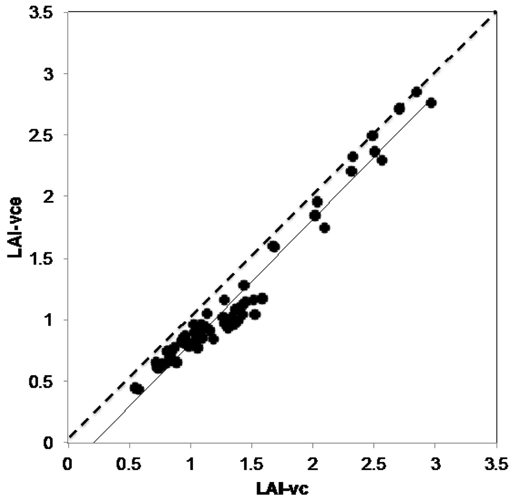 Figure 6 shows the relationships between results obtained with VitiCanopy (LAI-vce) and the planimetric/gravimetric method (LAIr) for the whole data set. LAI-vce was used in all comparisons since the manual stripping used to reduce canopy size does create clumping; as a matter of fact, Ω(0) ranged from 0.65 to 1. The R2 obtained was 0.84 with a slope b = 1.06, SEE = 1.89 and RMSE = 0.24 at p < 0.00001. For the 12 vines considered, VitiCanopy overestimated the real LAI by 0.56 on average, which corresponds to the contribution of the cordon and other non-leaf material within each image. When the average LAI obtained from images of bare cordons (LAI-vce = 0.56) was subtracted to all data points, a significant improvement of the relationship was achieved in relation to the 1:1 line (R2 = 0.86; b = 1.05; SEE = 1.89; RMSE = 0.24; p < 0.00001).