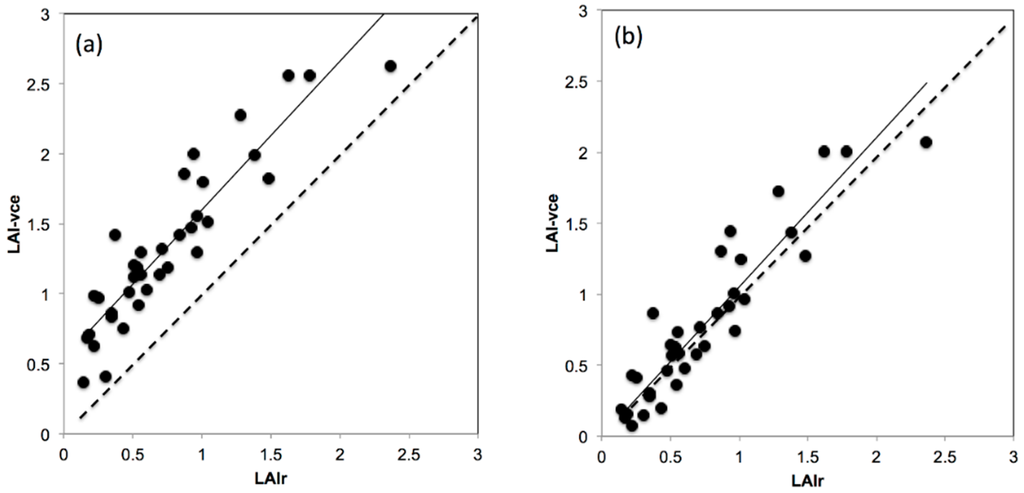 (a) Relationship between the leaf area index (LAI) measured by destructively removing all the leaves (LAIr) and using the cover photography App VitiCanopy (LAI-vce) using a common light extinction coefficient (k = 0.7) (method i) for the cv. Shiraz on a VSP trellis system in the McLaren Vale region; (b) Relationship between Real LAI (LAIr) and VitiCanopy LAI (LAI-vce) extracting the Y—intercept related to cordon and non-leaf material inclusion. For 6a and 6b, the continuous line represents the calculated regression; the dashed line represents the 1:1 relationship.