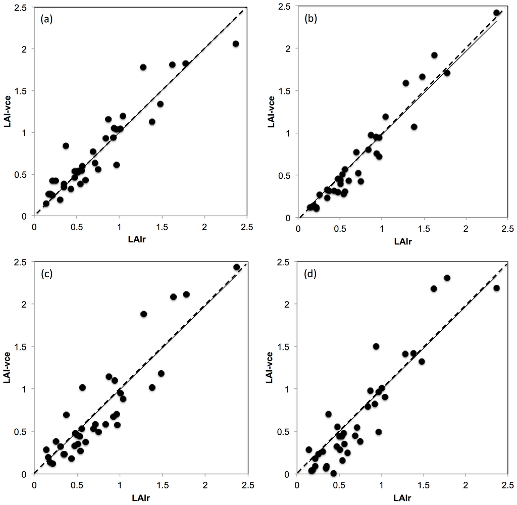 As seen before, Figure 6 shows the relationship between LAIr and LAI-vce using a common k = 0.7, which corresponded to the application of method (i) to obtain a proxy of k. Figure 7a shows the relationship between LAIr and LAI-vce by applying method (ii) with kr obtained by inverting Equation (7), which rendered highly significant statistical analysis (Table 4) as expected (R2 = 0.94; b = 0.98; SEE = 0.71; RMSE = 0.15; p < 0.00001). Figure 7b shows the LAIr and LAI-vce relationship by using method (iii) with comparable statistical results to method (ii) (R2 = 0.87; b = 1.0; SEE = 1.11; RMSE = 0.18; p < 0.00001). Figure 7c shows the LAIr and LAI-vce relationship by applying method (iv) using big gaps as a proxy of k with moderate statistical results compared to the rest (R2 = 0.83; b = 0.99; SEE = 2.13; RMSE = 0.25; p < 0.00001). Finally, Figure 7d shows the LAIr and LAI-vce relationship by applying method (v) based on image luminosity values to obtain a proxy of k with also moderate statistical results (Table 4) compared to the rest (R2 = 0.86; b = 0.99; SEE = 2.04; RMSE = 0.24; p < 0.00001). Table 4 shows the performance of methods to obtain a proxy of k. The best performing methods were (i), (iii) and (iv) due to higher R2, b, SEE, RMSE and p values.