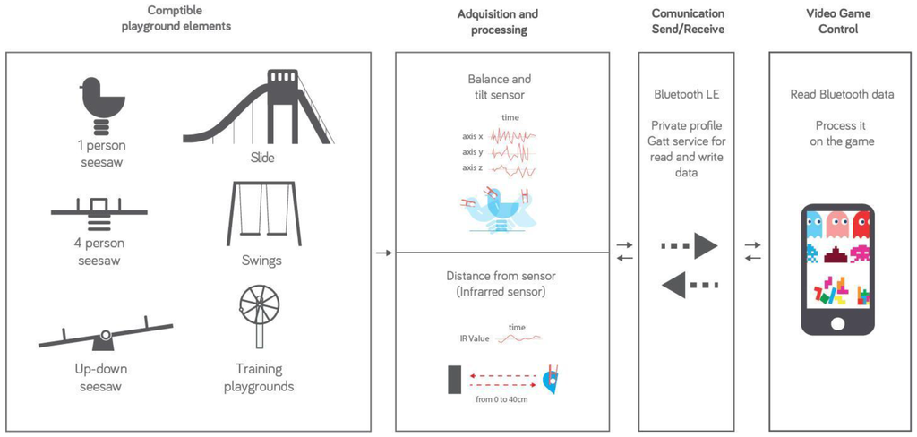 On the other hand, other research works and commercial solutions exist that merge playgrounds with virtual worlds, and thus promote physical activity outdoors. For instance, the interactive installation Water Games [16], is an excellent example of interactive outdoor gaming in which different dynamics are developed among large groups of users and where intensive multi-user interaction occurs. Another example is the Reactive Active Playground initiative [17]. In this research, new interaction and game systems were developed, which highlight the value that game systems designed with an open nature have for kids [18]. In such systems, a rich and dynamic partnership of children with the playing device occurs, because they personalize it with their own design of a game mechanism around the technological device and, at the same time, the game encourages their intellectual and creative development. Other similar examples are the Playware [19] and InnoPlay [20] projects. At the market level, the company Playnetic [21] offers a variety of products that allow interaction with different elements of the playground. To that end, they have created some elements with integrated technology that incorporate sound stimuli and that allow kids to, e.g., chat with each other, maintain songs playing while jumping in a stone, listen to stories after spinning a pendulum to generate energy in a storyball, etc. There exists other commercial solutions, such as Kompan Icon [22], i-play [23], Neos 360 [24,25] or Sona [26]. In all of them, the technology forms part of the elements of the playground. Finally, we would like to mention one of our previous projects called Zona de Recreo [27], first released in 2001, which consists of a multi user interactive platform arising from the transformation of a saucer swing that incorporates audiovisual digital technologies. The individual or collective use of this physical game interface, which we call video swing, allows the user to interact with a 3D virtual game by using the motion of his/her body. This application can be seen as one of the first solutions that incorporated technology (video games) in playgrounds.