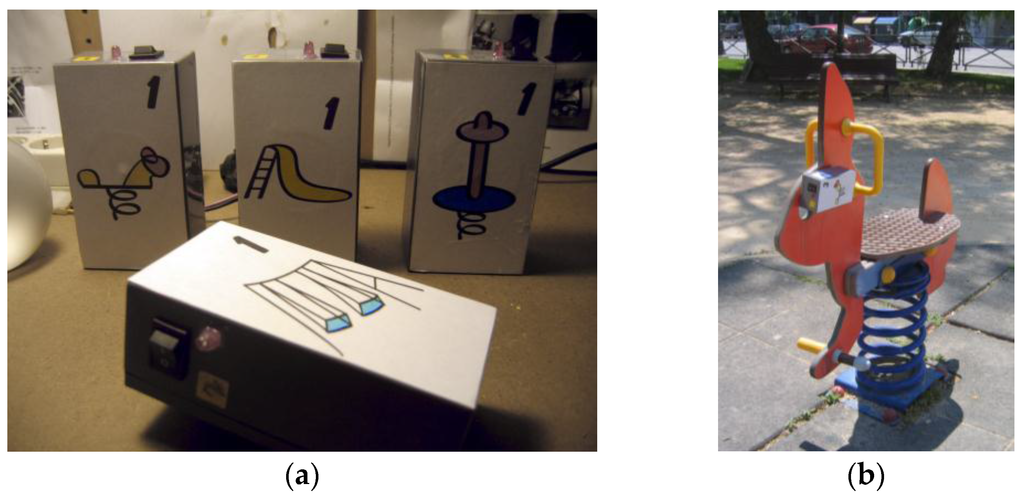 First version of the sensor. (a) The different models, according to the elements of the playground; (b) one of the sensors attached to the hobbyhorse.