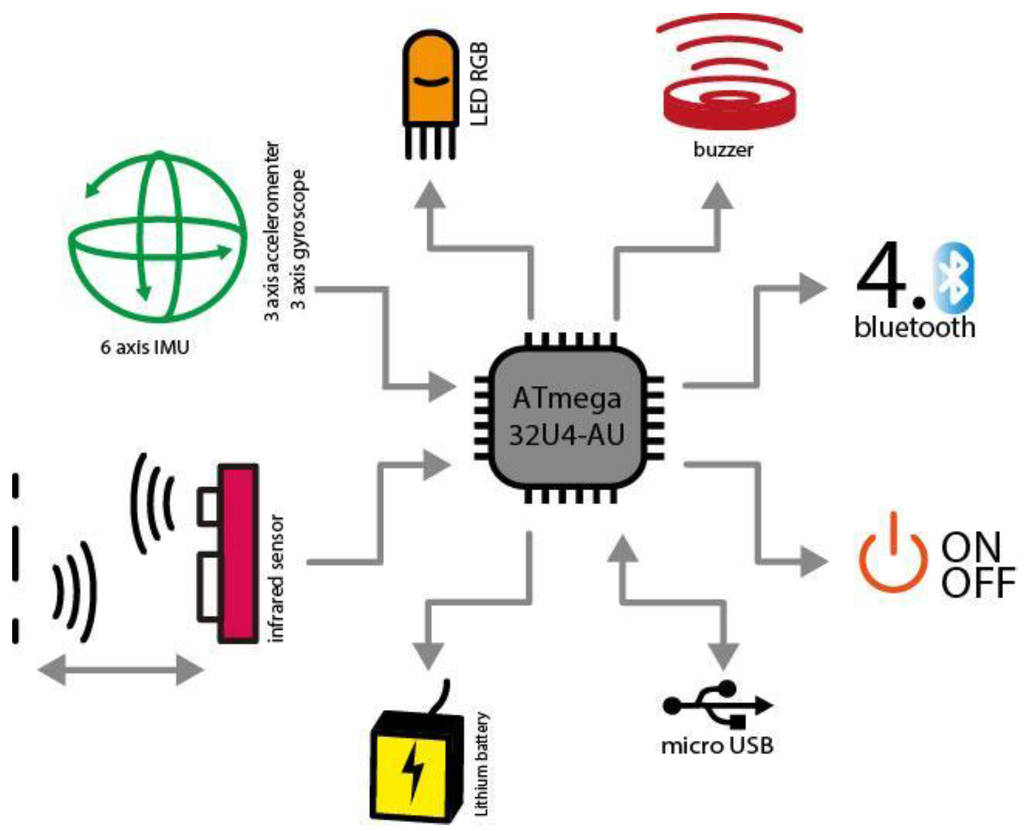 The current version of the HybridPLAY is the third version (released in 2015) [31]. In this case, the electronics of the sensor were also designed by Miguel de las Heras (Hangar, Barcelona, Spain), and consisted on the optimization of the components from the second version. The main components of the HybridPLAY sensor are, in this version (Figure 6): an ATmega32U4-AU processor (compatible with Arduino), a USB micro connector, a three-axis accelerometer and gyroscope, an infrared proximity sensor, a LED button and a sound component. In this case, the connectivity is achieved with Bluetooth LE (4.1).