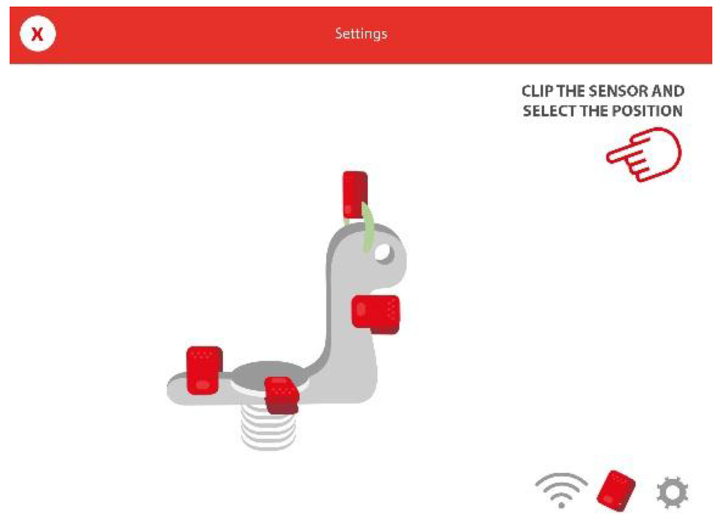 When attaching the sensor on any element of the playground that is provided with one or more springs (e.g., seesaw or hobbyhorse), the behavior of the sensor is similar to the traditional joysticks. Initially, a simple but effective calibration process is carried out (Figure 9). First, the sensor is coupled in any of the orientations indicated in the app, and the user selects in the app the chosen position.