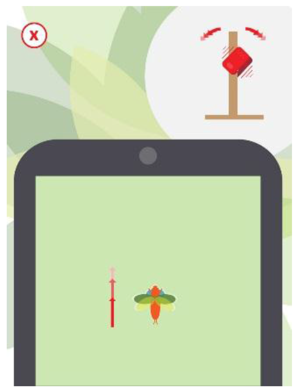 Thanks to its sensor, two general types of motion can be detected: tilt and inclination. With the tilt, sudden movements are detected, and the seesaw/hobbyhorse game dynamics associated with it are established, such as increasing energy or the value of a variable of the player. For example, in the case of Moskis, the fly begins its flight when tilting the element of the park (Figure 10).