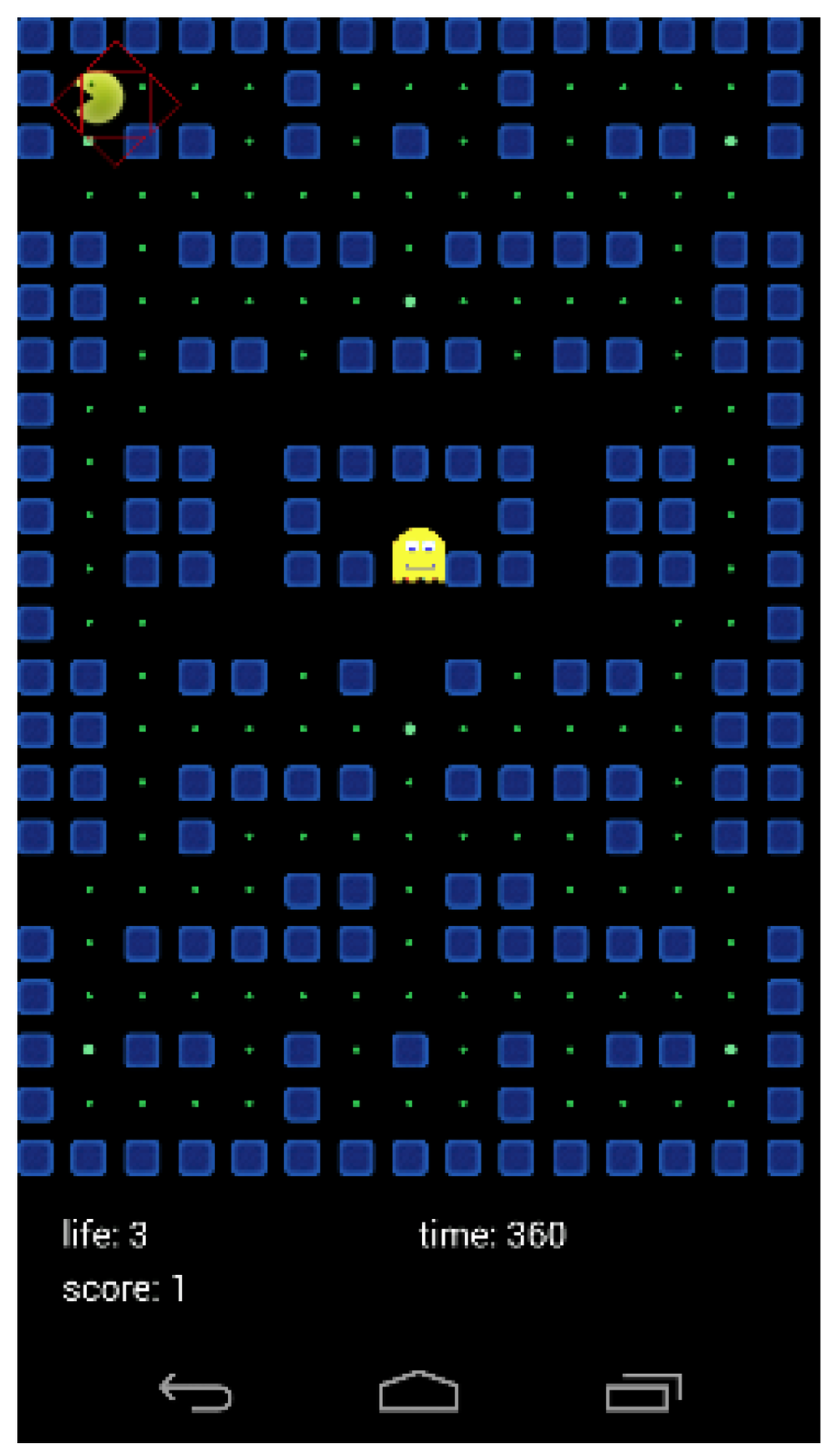 The 4-way movement is more complex, and is detected when there is a significant variation in ϕ (tilt left–right) and θ (tilt forward–back) with respect to the values recorded in the initial calibration. These movements are used in video games to control the direction of the user, often on a two-dimensional plane in an aerial view, such as in the mazes of the adaption of the classic arcade video game Pac Man (Figure 11).