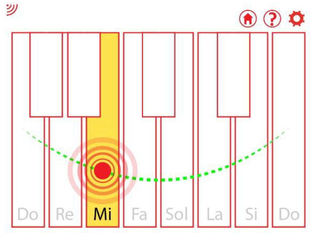 These movements can be reflected in the actions of the app in different ways, for example to control the speed of the protagonist or to also control its position, moving from left to right of the screen, in a linear motion, or forming an arc. An example is depicted in Figure 13, where the movements of the swing produce an interaction in the video game HybridEDU (in this example, intended to play a piano).