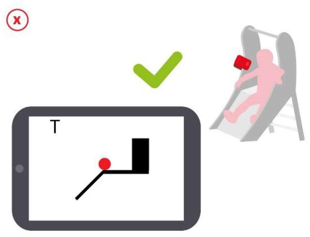 In this case the sensor must be attached to the side of the slide, so that the infrared proximity sensor is facing the child, sensing his presence when sitting at the top of the slide. To ensure that the child is waiting to pounce, the app detects whether the infrared proximity sensor has been cut for at least 2 s. Once the presence of the child has been detected, a signal appears in the game indicating that the system is ready to detect his jumping (Figure 14).