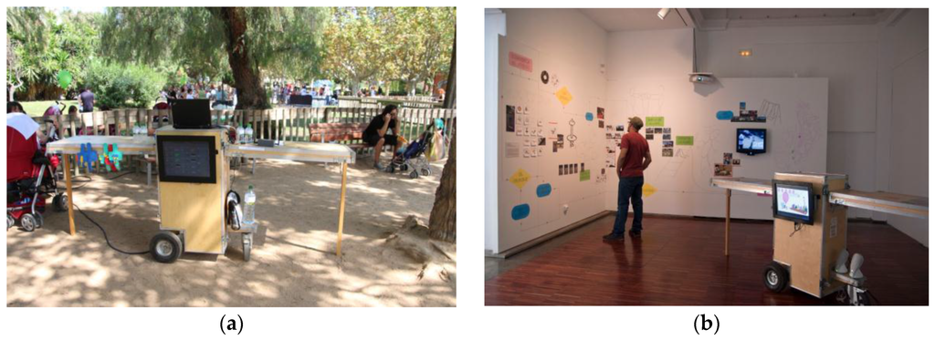The HybridPLAY system was presented at some artistic exhibitions, attracting the curiosity of the general public. In Figure 15b the system is depicted at the Techformance Festival (Murcia, Spain, 2009). As this was version 2, the cart was used, which was designed with the purpose of augmenting the autonomy of the overall system. The cart was provided with a car battery and an inverter, that allowed us to increase the autonomy of the system from 2 to 6 h and also to recharge the PDAs. This was relevant for the exhibitions, where the system was on display for the whole day.