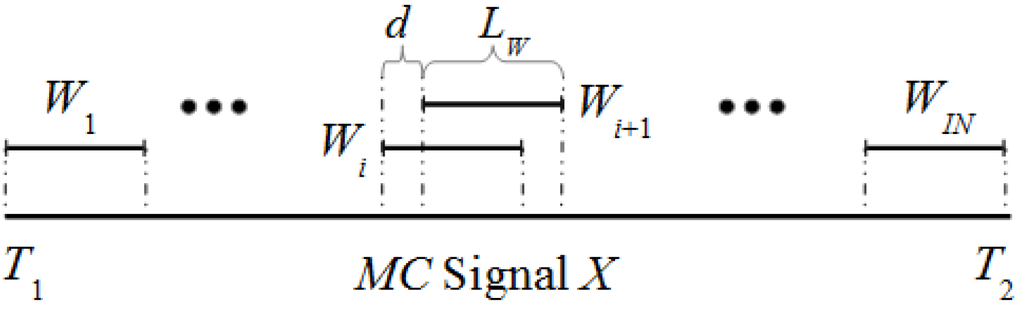 Step 1: Specification of windows. The algorithm uses a sliding window approach. Figure 1 shows the details of the sliding window in a MC signal X along the interval [T1, T2]. If the window Wi of size Lw is defined by the interval [t1, t2] then the window Wi+1 is defined by [t1 + d, t2 + d] with d > 0. As first step, a set of IN windows is selected for a specific Lw and d.