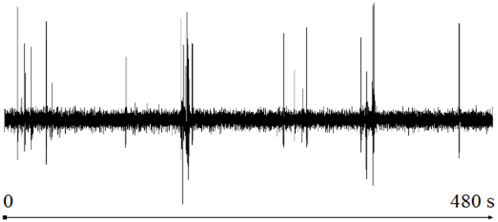 The proposed algorithm has been tested to detect artifacts in multichannel EEG signals. The test signal is an EEG recording of 8 min duration used in [8] to highlight the utility of the DETECT toolbox. The data are sampled at 256 Hz using a 64-channel Biosemi Active Two System (Amsterdam, Netherlands). Figure 2 shows the channel CH1(t) of the EEG recording. Our test uses all of the channels.