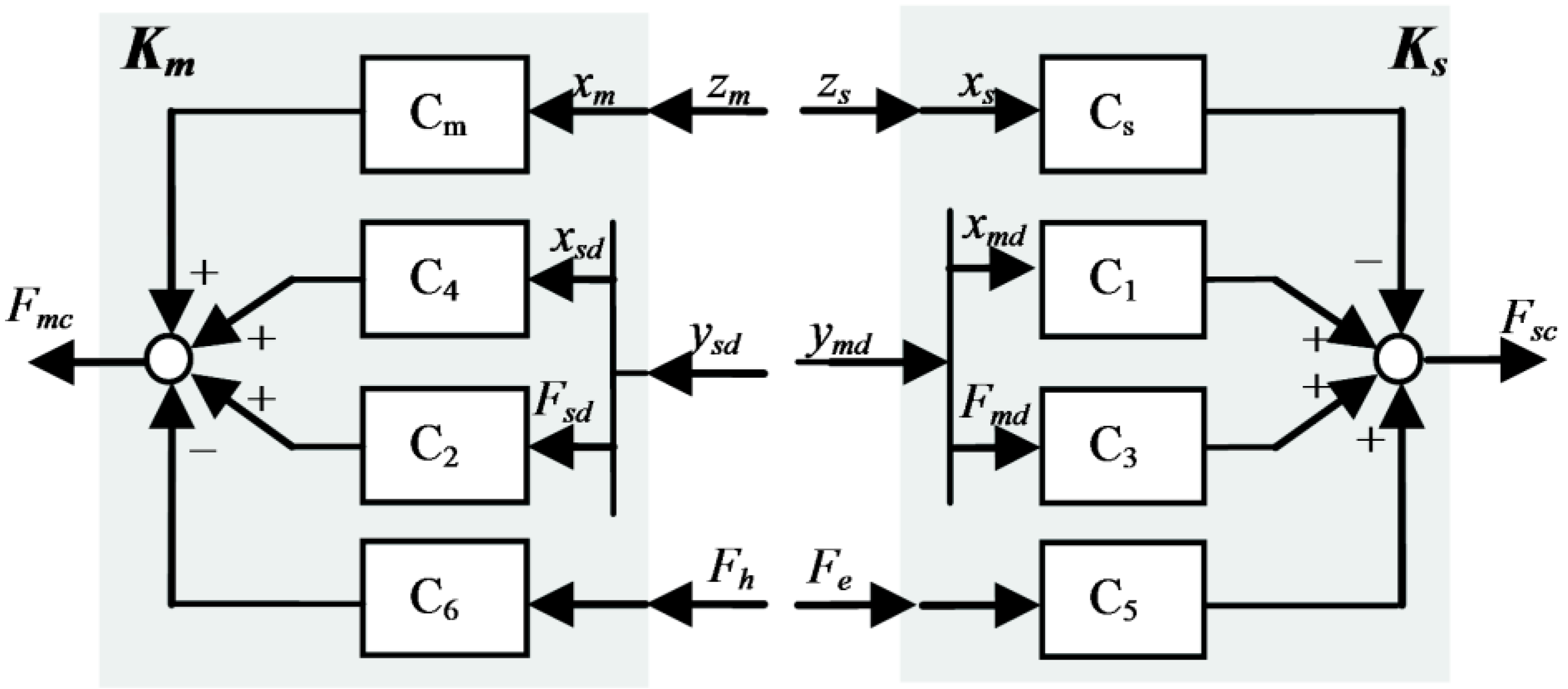 Figure 2 as given by Equation (5) allows proper controllers in Equation (25) to be selected based on ideally optimized transparency, that is, they do not contain single or double differentiators like classical 4C solutions and so avoid negative effects with noise. See the explanation in