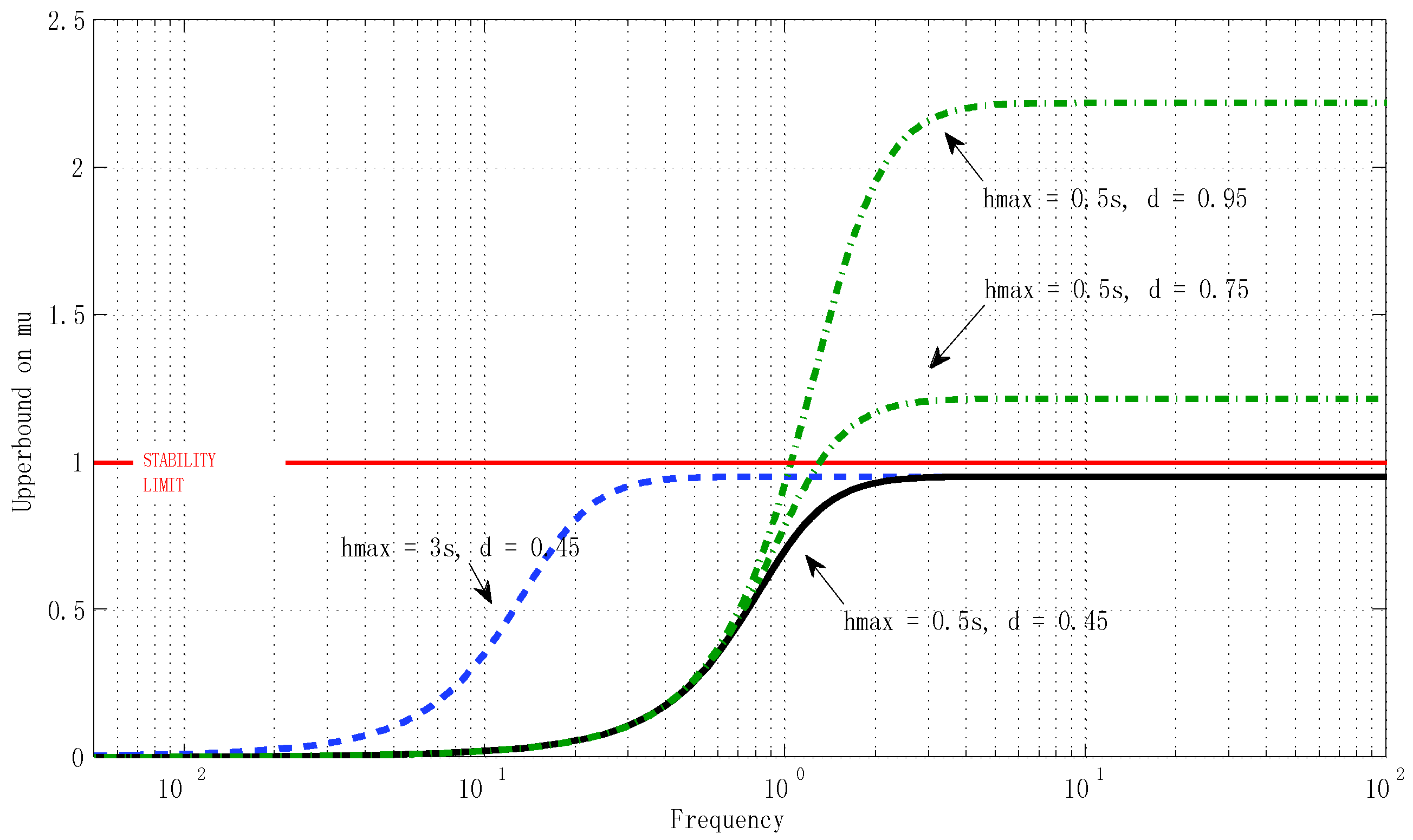 There was an easy way to deal with Equation (20) numerically: the delay uncertainty parameters (hmax, d) could be discretized in the ranges of interest, and for each discretized value, the minimum γ could be computed. These computations can be represented in the form of 3D surfaces and the designer can use the numerical results to decide, depending on the expected delay uncertainty, the adequate tuning of γ to be included in the controllers.