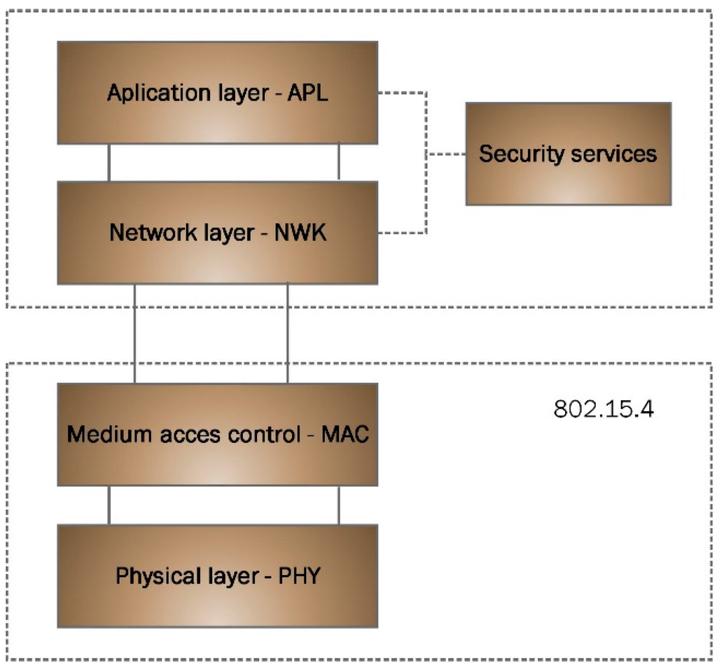 The 802.15.4 standard is framed within the area of the wireless personal area networks (WPANs), with low consumption and cost. As a result, it is increasingly gaining relevance in the industrial domain. Standard 802.15.4 only defines the physical and media access control layers. A network and application layer has been developed on this standard, as shown by Figure 2.
