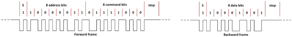 The DALI protocol is based on the master/slave model, in which one master can control up to 64 slaves. The master sends frames (forward messages) to any slave device of the system and receives a response frame (backward message) if the forward frame requested a response. As shown by Figure 4, a forward master–slave frame (ballast) consists of 19 bits, distributed as follows: one starting bit, eight bits for routing, another eight bits for data and two stop bits. Meanwhile, a backward response frame consists of 11 bits, a start bit, 8 bits for data and two stop bits. At the physical layer, DALI uses an effective data transfer rate of 1.2 kb/s and a tolerance in the timing bit of 10%.