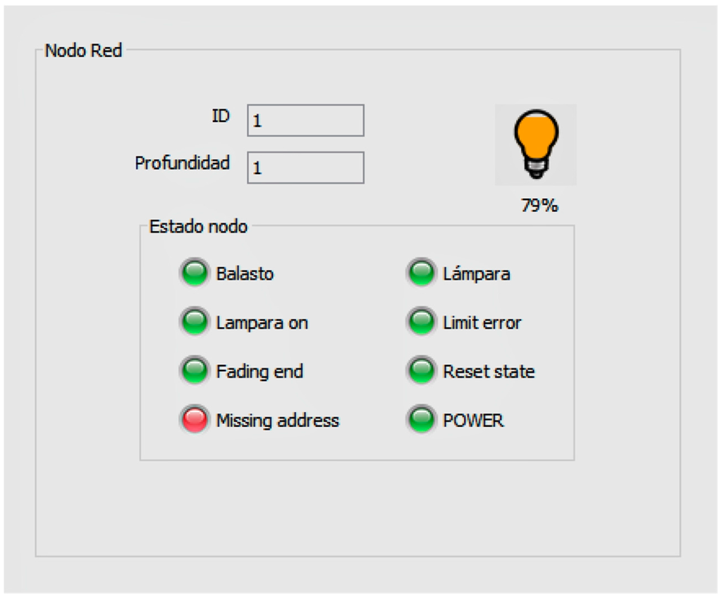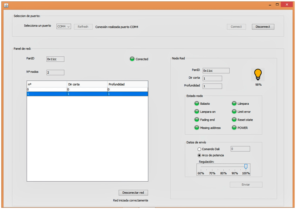 By means of SCADA, a user with the appropriate licenses has both individual and collective control over the lamps. The coordinator (who is connected to the computer) deals with forming/managing the tree wireless network, so that an intermediate router node will be used to reach a lamp if the coordinator is unable to do so. Once all of the luminaires have been located, their status may be viewed and modified, making it also possible to specify different modes of operation from the interface. Figure 5 shows one of the windows of SCADA.