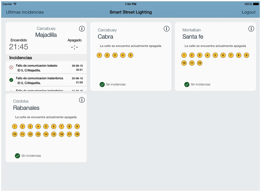 The lighting control system has been installed in two towns within the province of Cordoba, in the Andalusia region in southern Spain. In both cases, the system was deployed without any incidents and is currently being used. Before the deployment of the system, a photometric study was performed to determine the correct location of the lamps.