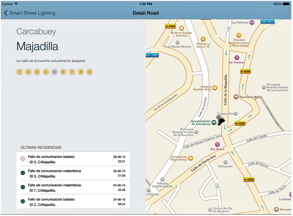 A graphic application for mobile devices has been developed to manage maintenance tasks for lighting networks. The application obtains information from the database created by the SCADA system. Once the application has been launched and the user has been identified, the streets allocated to the operator will appear. If any failure has happened, the application will inform the user with an interface such as the one shown in Figure 7. Each streetlamp is identified by a unique identifier (nodeID), which is set by hardware when the node is installed, as mentioned in Section 3.1.