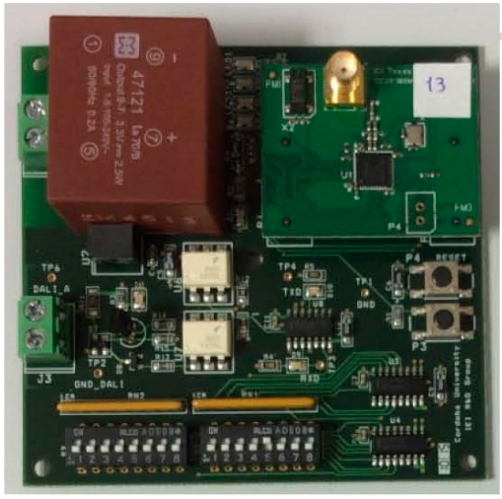 The decision to design a specific mote is a usual process in many works related to wireless sensor networks. In works such as [,,,], motes were developed for specific applications to minimize total consumption. In [], a wireless sensor mote was designed for precision horticulture applications. In other works, some motes were designed to search for possibilities not offered by commercial motes. For example, in [], a mote was designed to support remote hardware modification. Lastly, regarding wireless nodes to control LED lamps in over-the-air lighting-control systems, motes using the XBee module of the Digi MaxStream radio frequency were designed in [,]. In [], the Waspmote module was improved by connecting sensors to it and including control over LED lamps. In [], a simple intelligent wireless module was presented for use in street lighting systems that provides a specific driver capable of communicating through the DALI protocol to the lamp.