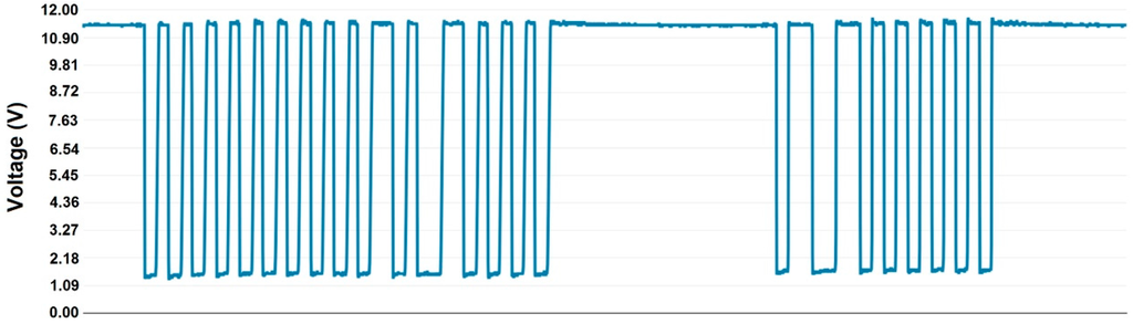 As will be indicated below, the DALI interface uses voltage levels to represent the high logic level between 11.5 V and 22.5 V. As a result, a power supply that generates a voltage within this range needs to be used. On the other hand, the control part of the node of the DALI bus needs to be isolated. To do this, we used the MEU1S0315ZC DC/DC converter by Murata Power Solutions []. The MEU1S0315ZC is an ultra-miniature through-hole 1 W DC/DC converter that is available in a ZIP-style pinout. It is ideally suited for providing local power supplies on control system boards, with the added benefit of 1 kVDC galvanic isolation to reduce switching noise. From the 3.3 VDC voltage, it generates an output voltage of 15 VDC with 81% efficiency.
