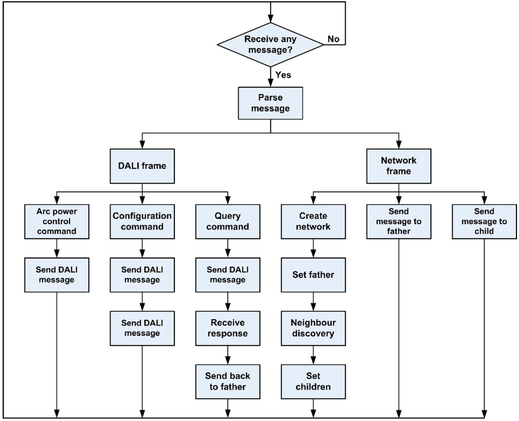 Each node has two unique identifiers—the radio module’s MAC address and a node identifier (nodeID)—that allow it to be located by the application, similar to a lamp address. In this way, when a radio module is replaced, only the same nodeID needs to be selected in the node. This nodeID is easily set with a microswitch. The nodeID has a length of 16 bits and can select up to 65,536 ballasts, which increases the number of ballasts that can be routed by a DALI controller. The user application only needs to know the nodeID. The network layer maintains some tables with the MAC addresses where the frames need to be sent to get to their destination. These tables are dynamically created when the network is initialised, when a node is connected, etc.