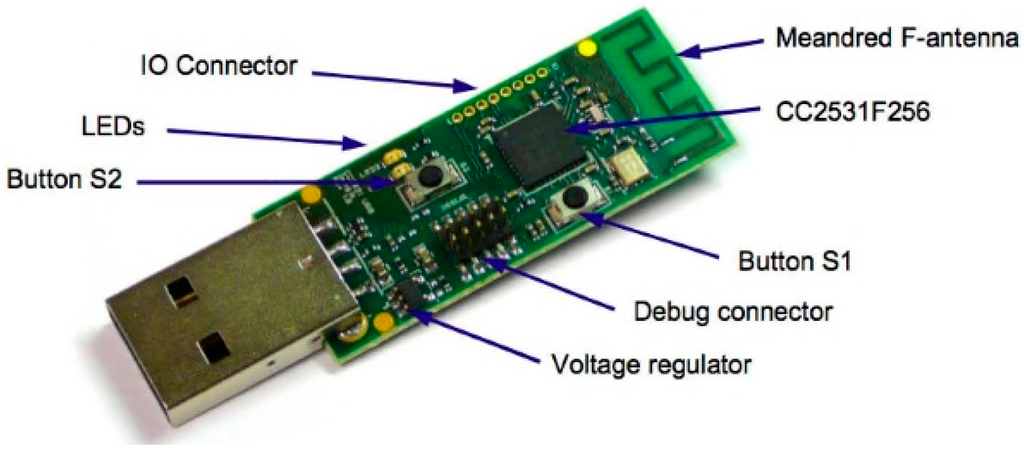 - Texas Instruments. CC2531USB Hardware User’s Guide, SWRU221A. Available online: http://www.ti.com/lit/ug/swru221a/swru221a.pdf (accessed on 1 February 2016).