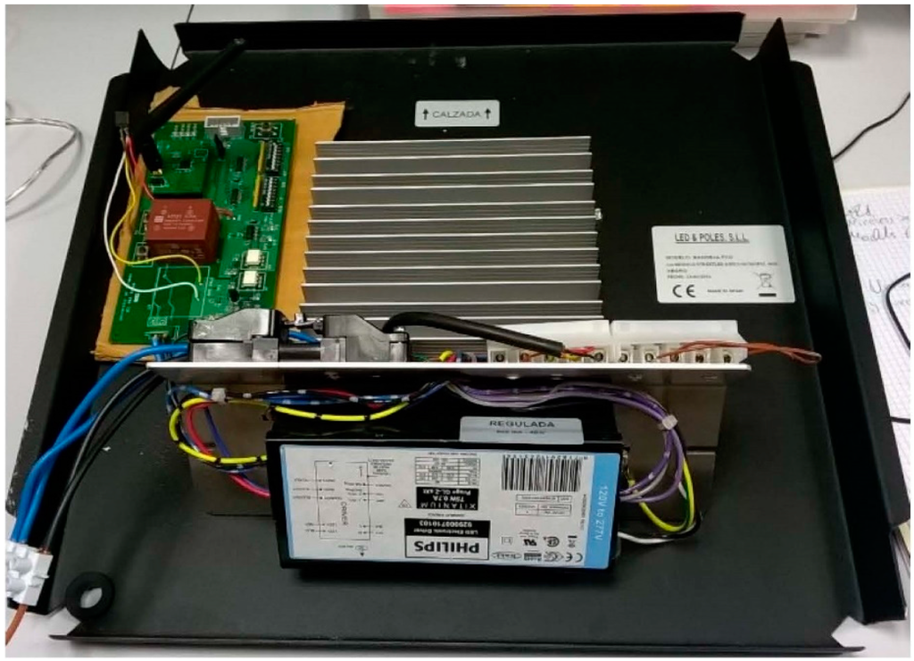 Several recommendations exist to reduce the electric energy consumption of public lighting []. One of these actions is to control the on-off timespan of the lighting. This period can be controlled using photocell relays or astronomical time relays []. The photocells are activated or deactivated depending on the level of environmental light. Their main disadvantage is their low sensitivity to dawn and the presence of clouds, which can cause the relay to be activated too soon. On the other hand, astronomical time relays use a program that contains the sunrise and sunset times in each time zone. A second action is to reduce light output (dimming) during hours with reduced traffic by reducing the voltage applied to each lamp, which reduces electric energy consumption. Lastly, another proposed action is to use high-performance lamps and lighting devices. This consists of installing smart, adjustable electronic ballasts that are able to automatically detect electric failures and lamp problems; measure and send data, such as on the state of the lighting, the lighting level, the energy consumption, voltage, current, and power factor; and receive interruption and lighting control commands.