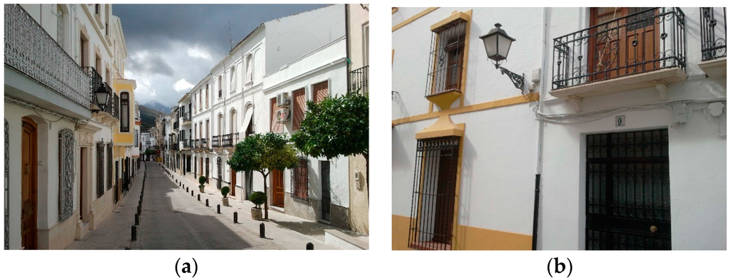 (a) General overview of the street; (b) Details of the lamp post installation.