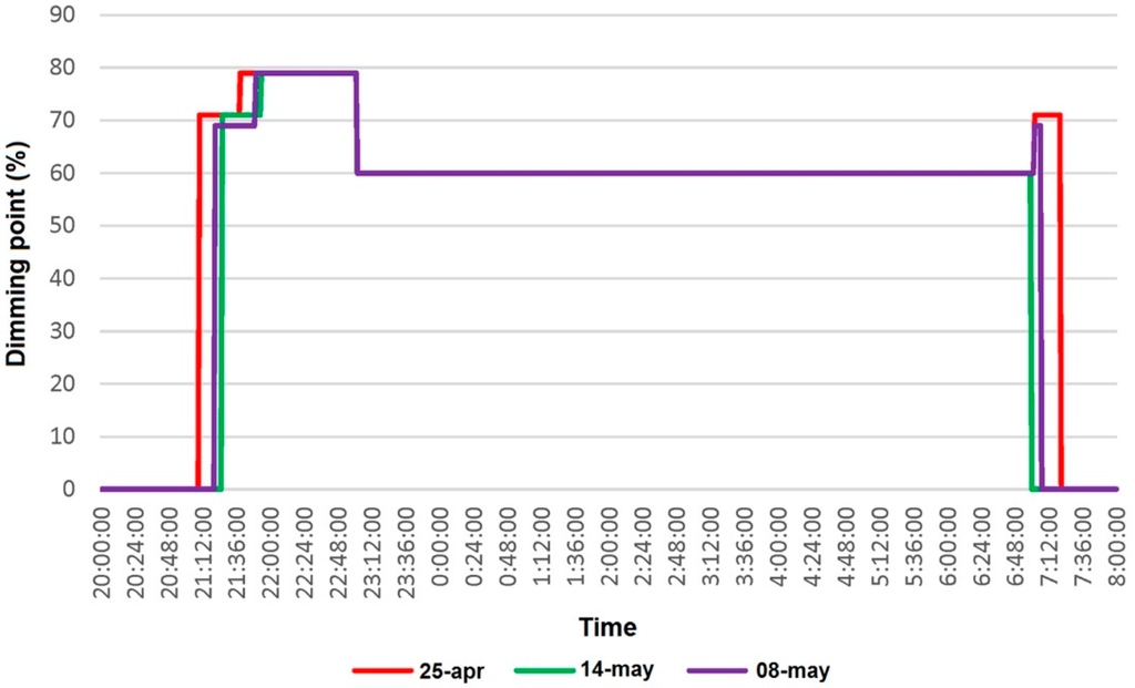 The smooth turn-on and warming period is performed to optimize their lifespan and reduce peaks, flickers and other instabilities that used to appear in the main grid when switching on a huge number of lamps. After the smooth turn-on period the dimming increases to turn into full illumination. Later the dimming is set to the saving mode operation. From that moment onwards when starts the sunrise turn-off mode (turns again to 70% until sunrise when are turned-off). As can be seen, on 14 May, these lamps did not reached the sunrise turn-off mode as the sunrise happened before 7 a.m.