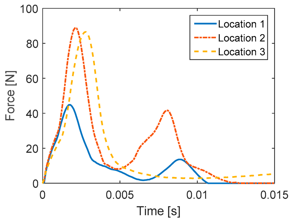 To obtain the actual impact histories that would be input for numerical simulation and to verify the numerical simulation results, impact tests were conducted by applying impact loadings on a steel cantilever beam on which a PVDF sensor was attached. The piezofilm lab amplifier [34] operating in charge mode was used for signal conditioning. Feedback capacitance of 100 nF was selected. The lower cut-off frequency and higher cut-off frequency were selected as 0.1 Hz and 100 kHz, respectively. The NI USB-4431 enabling four 24-bit simultaneous analog inputs was used for data acquisition. 10 kS/s was chosen for sampling rate and 1 kS/s for data windowing for real-time visualization of the PVDF sensor’s output response during the impact tests. One DT4-028 K/L PVDF sensor [35] was attached to the steel cantilever beam by a commercial double-coated adhesive tape. One edge of the PVDF sensor distances 30 mm from the fixed end of the cantilever beam (Figure 4). The impact hammer PCB 086C03 manufactured by PCB Piezotronics with a mounted plastic tip was used to apply impact force on the cantilever beam at the three impact locations illustrated in Figure 4. During the impact tests, impact signal was transmitted to the ICP sensor signal conditioner provided by PCB Piezotronics. A unit gain was set on the ICP signal conditioner. To verify the numerical simulation results, strain gages were also attached to the opposite side of the cantilever beam to obtain “true” strain (Figure 4). Typical impact force time-histories are shown in Figure 5. Impact force histories at locations 1 and 2 contain two peaks which are both due to the physical contact between the impact hammer and the cantilever beam. Particularly, the first peak represents the first time when the cantilever beam is collided by the hammer tip. The energy absorbed by the cantilever beam is then transformed to displacement of the cantilever beam’s free end, which mainly excites the first vibration mode. Right after the first collision, the hammer tip continues to move in the same direction as that of the cantilever beam’s free end due to the effect of inertia induced by the hammer’s weight and velocity. Approximately one to two milliseconds after the first collision, the hammer hits the tip of cantilever beam the second time, which causes the second impact. However, for impact at location 3 which is close to the fixed end, impact energy absorbed by the cantilever beam is transformed mainly into excitation of higher modes rather than displacement at the point of collision. Therefore, only one peak appears in the time history of impact at location 3. However, time history of impact rather than impact force magnitude (i.e., peak) was employed in the numerical simulation, which means impact force energy is taken into account in the prediction of the PVDF sensor’s output voltage in this study.