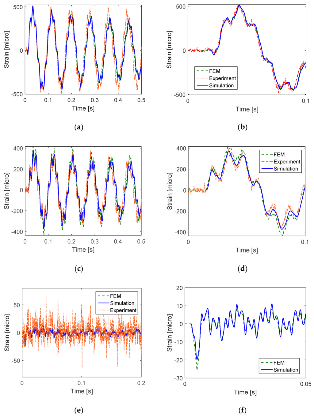 Figure 7. Strain measured at 70 mm from the fixed end for three impact locations. (a,b) Impact at location 1; (c,d) Impact at location 2; (e,f) Impact at location 3.