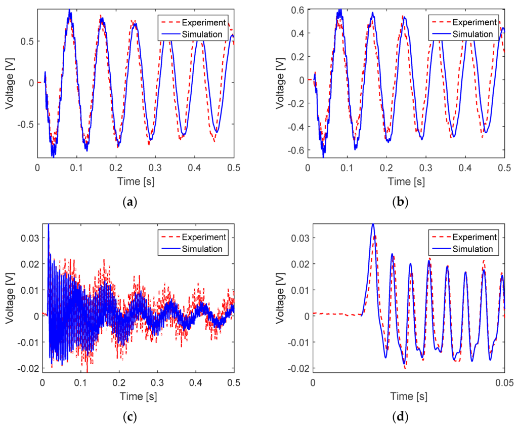 Figure 8. Simulation results for three impact locations. (a) Impact at location 1; (b) Impact at location 2; (c,d) Impact at location 3. The sensor size is 155 × 19 × 0.028 (mm). One sensor edge is placed 30 mm from the fixed end of the cantilever beam so that the lead wire goes towards the fixed end.