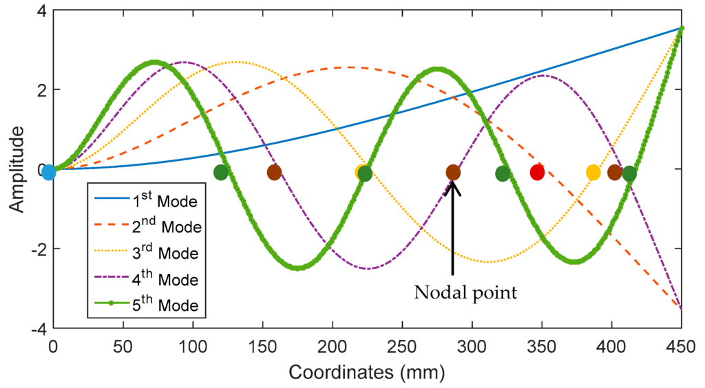 where ϕ r ( x ) is the mass-normalized eigenfunction; η r ( t ) is the modal coordinate of the cantilever beam for the r-th vibration mode. If the cantilever beam is assumed to be proportionally damped, the eigenfunctions denoted by ϕ r ( x ) are the mass-normalized eigenfunctions of the undamped free vibration [30,31].