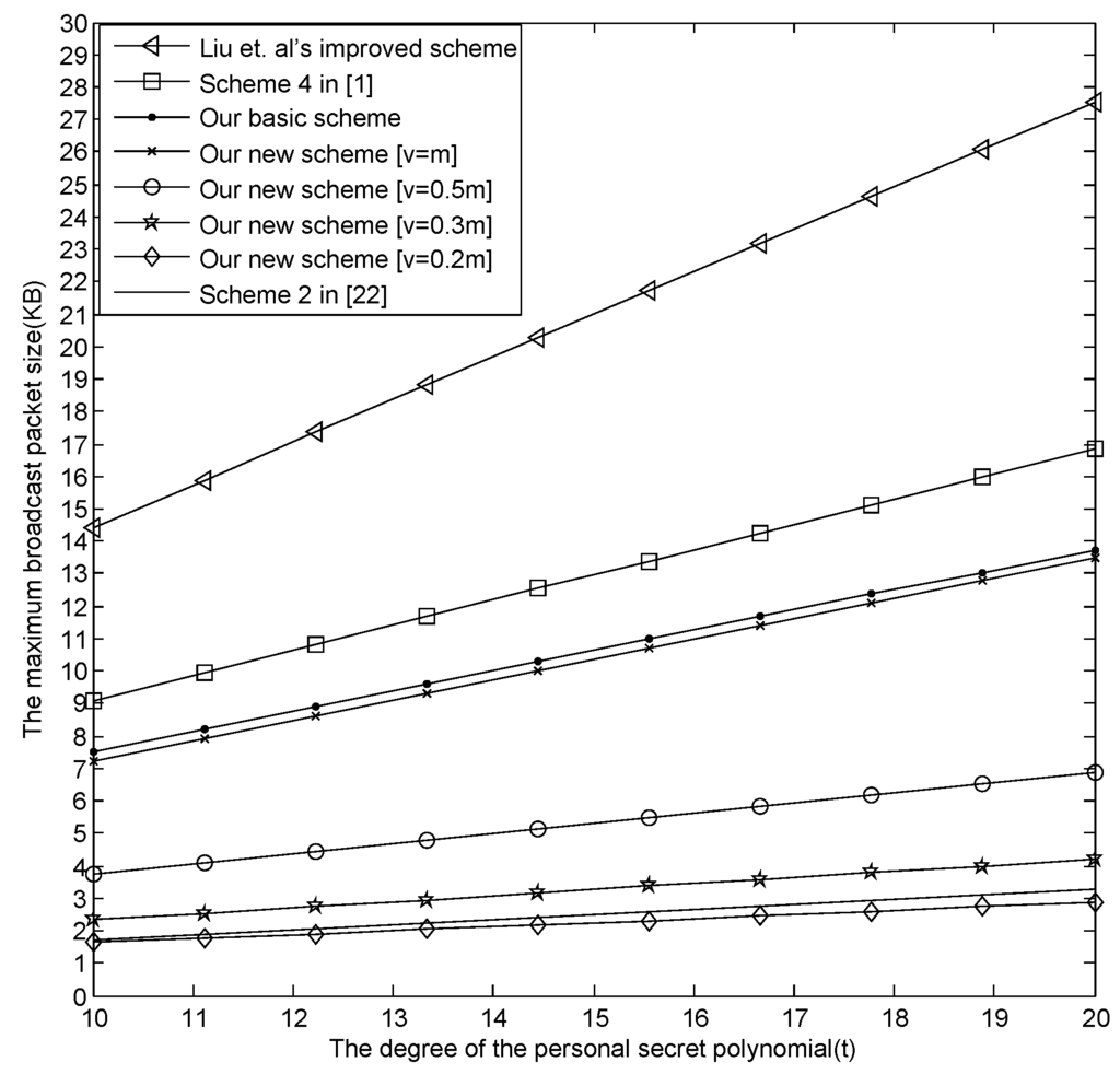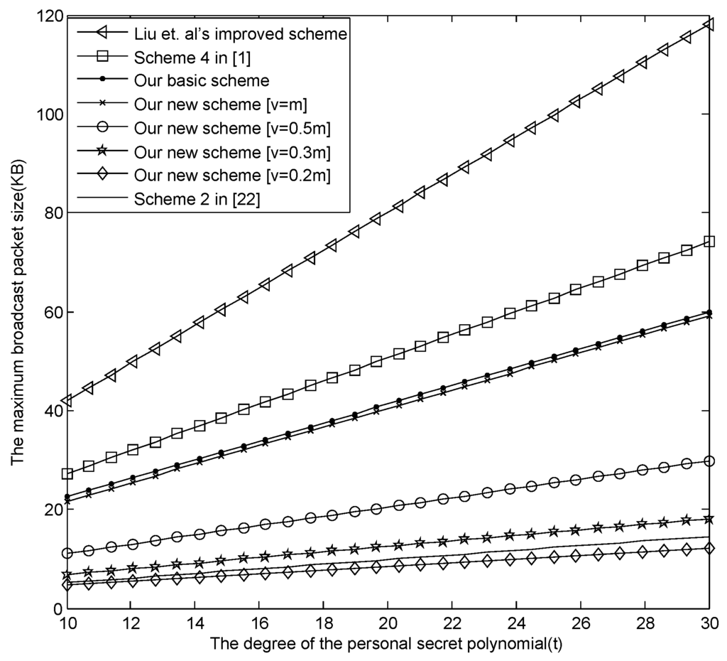 Now, we analyze the relationship between the maximum size of the broadcast message and the degree t for different E-SGKD schemes. Suppose denotes that x rounds down to the nearest whole unit. Let , and t varies from 10 to 30.