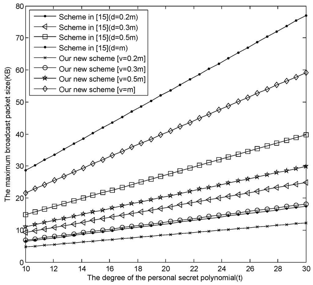 Under the above assumption, i.e., m equals 10 and the maximum size of the broadcast message is 4 KB, we now check if the known E-SGKD schemes are suitable for ZigBee wireless networks or not. From Figure 5, we can find that when t = 10, the size of the broadcast message is more than 4 KB in the most efficient E-SGKD scheme, i.e., our new scheme with , and is less than 4 KB in our new E-SGKD scheme with , and and Hong et al.’s efficient P-SGKD Scheme 2. Meanwhile, the size of the broadcast message increases as t increases. When t reaches 20, the size of the broadcast message is more than 7 KB in our new scheme with , while is still less than 4 KB in our new E-SGKD scheme with , and Hong et al.’s efficient P-SGKD scheme. Note that when , the communication overhead is even lower than the most efficient P-SGKD scheme.