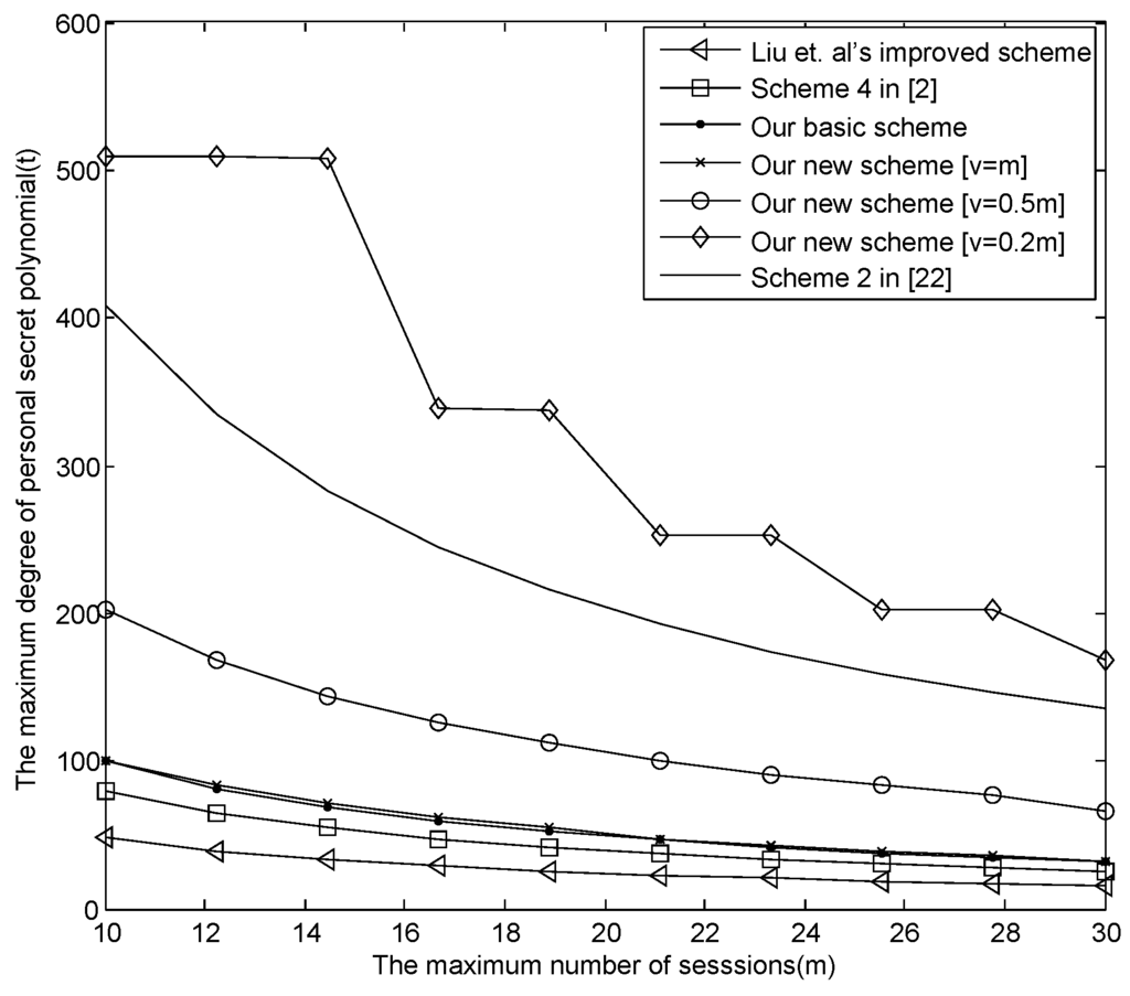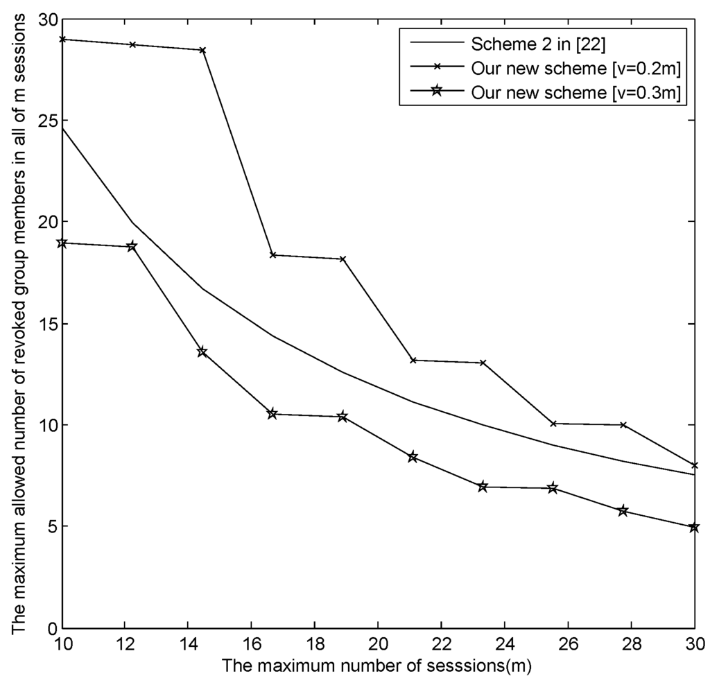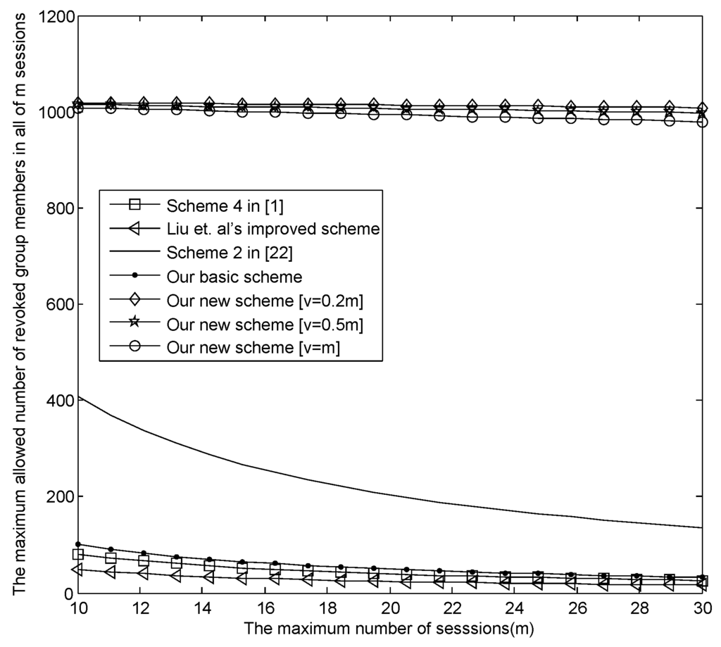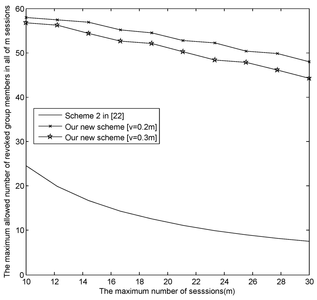 - The relationship between m and the maximum revoked users in all sessions .Figure 4 presents the relationship between m and the maximum revoked users in all sessions , where , , and , respectively. From Figure 4, when , in our new E-SGKD scheme is nearly 1000 with v = 6, 9, 15 and 30, while in Liu et al.’s improved scheme, Blundo et al.’s Scheme 4 and our basic E-SGKD scheme is nearly 15, 25 and 32, respectively. Additionally, we can find that in the most efficient P-SGKD scheme, i.e., Hong et al.’s Scheme 2 [22], is 135. Thus, our new E-SGKD scheme allows more revoked users than all other known E-SGKD schemes and P-SGKD schemes, i.e., the new scheme can resist more users’ collusion attacks.